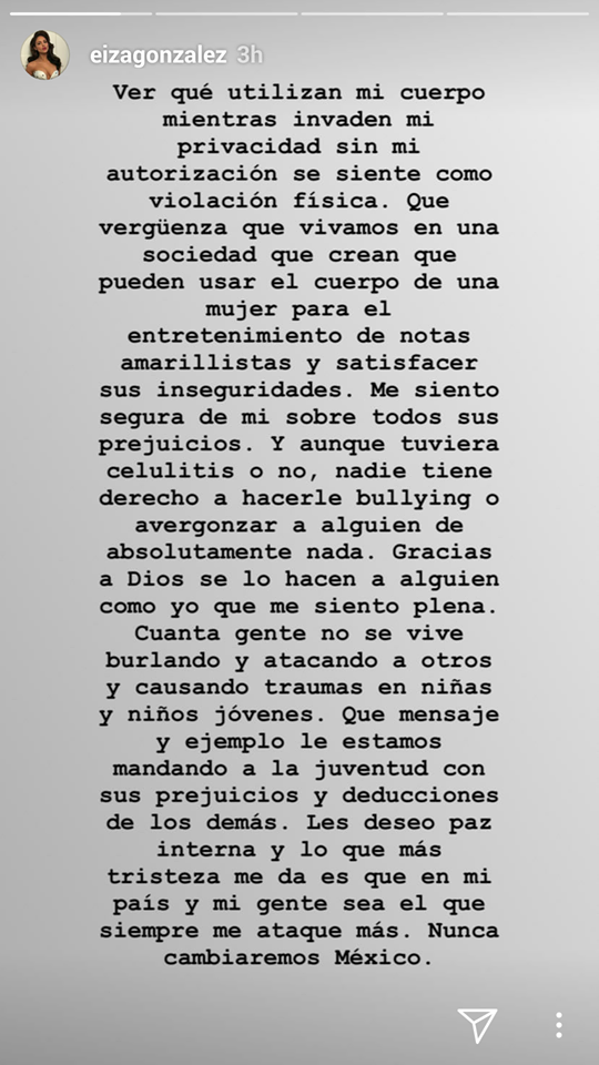 A pesar de las criticas, aseguró que se siente plena y segura de sí misma. "Me siento segura de mi sobre todos sus prejuicios. Y aunque tuviera celulitis o no, nadie tiene derecho a hacerle bullying o avergonzar a alguien de absolutamente nada. Gracias a Dios se lo hacen a alguien como yo que me siento plena", afirmó.