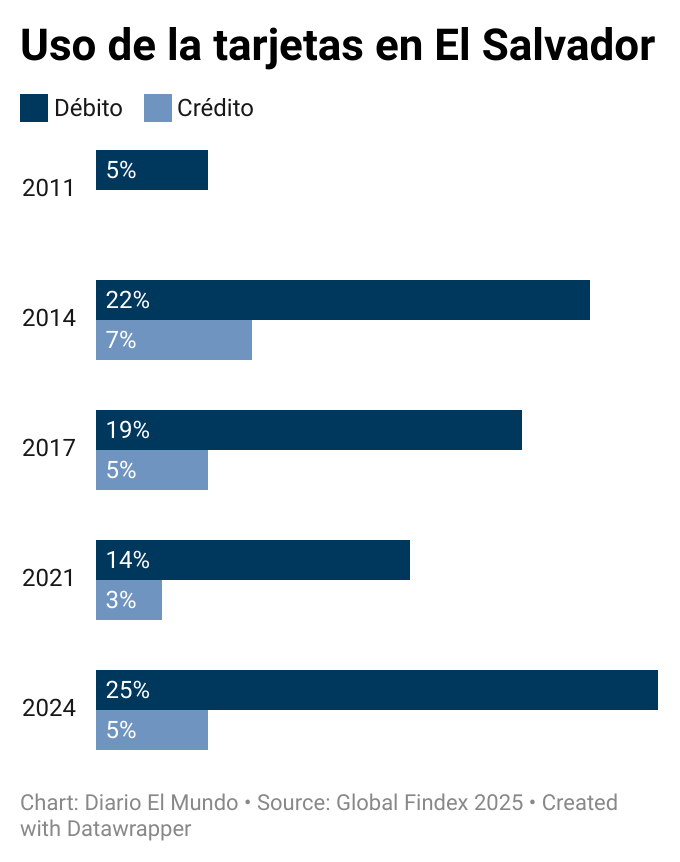 El uso de la tarjeta de débito, que depende del dinero que tengan los usuarios, ha crecido más entre los salvadoreños desde el 11 % que se identificó en el primer informe de 2011, cuando se presentó el primer informe del Global Findex.