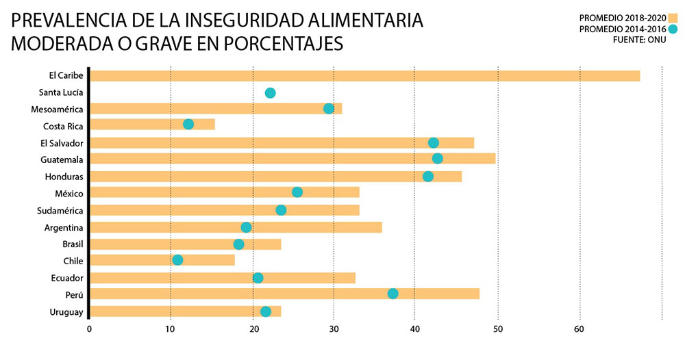 De esa manera, la inseguridad alimentaria afecta a 267 millones de personas en América Latina y el Caribe, 60 millones adicionales frente a 2019 (9 % de incremento). Esto significa que cuatro de cada 10 personas en la región tienen dificultades para una alimentación adecuada.