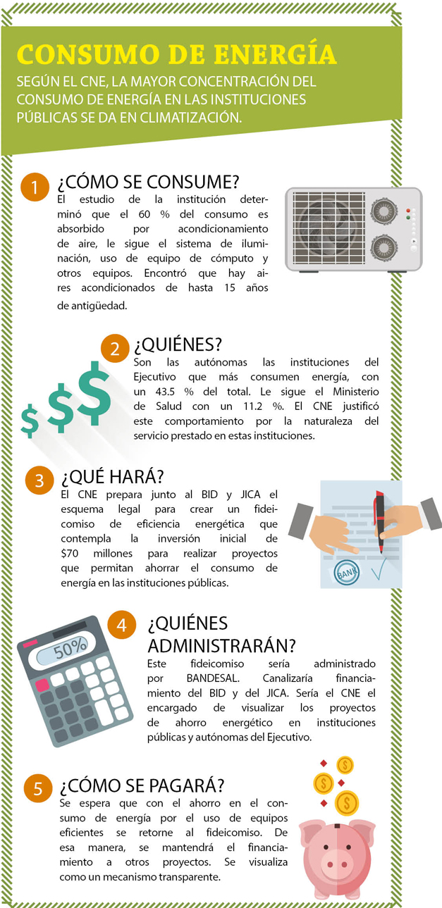 De acuerdo al CNE, a través de los Comités de Eficiencia Energética Institucionales (COEE’s), creados en 2012, en el último año se invirtió más de $1.2 millones en 79 proyectos. El 30.9 % de esa cantidad, equivalente a $386,957, fueron destinados para el cambio de aires acondicionados.