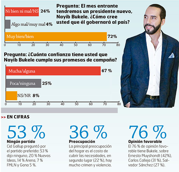 El 72 % cree que el presidente electo Nayib Bukele gobernará muy bien o bien y el 67 % tiene mucha o alguna confianza que cumplirá sus promesas, el 25 % poca o ninguna. De acuerdo a la misma encuesta, el 53 % de los entrevistados tiene mucha o alguna confianza de que nombrará a un gabinete con personas honradas, el 40 % “poca o ninguna confianza”, el resto no responde.