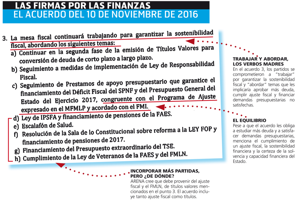 Un acuerdo de cuatro páginas firmado por los dos líderes de los partidos mayoritarios, ARENA y FMLN, el presidente de la República, Salvador Sánchez Cerén, es el mismo argumento que usan ambos para acusarse de incumplir aquel compromiso.