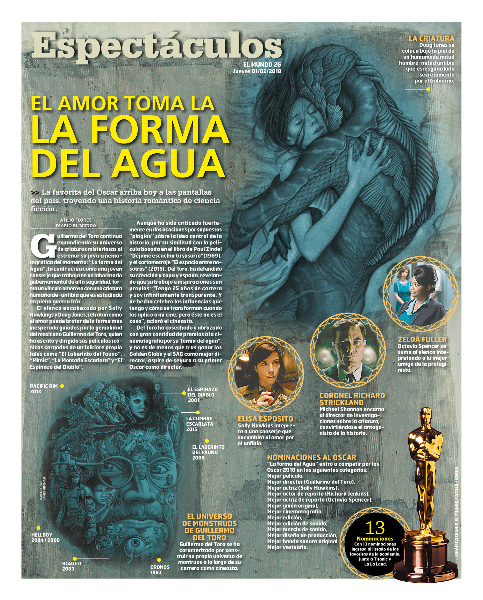 El elenco encabezado por Sally Hawkings y Doug Jones, retratan como el amor puede brotar de la forma más inesperada guiados por la genialidad del mexicano Guillermo del Toro, quien ha escrito y dirigido sus películas icónicas cargadas de un folklore propio tales como “El Laberinto del Fauno”, “Mimic”, “La Montaña Escarlata” y “El Espinazo del Diablo”.