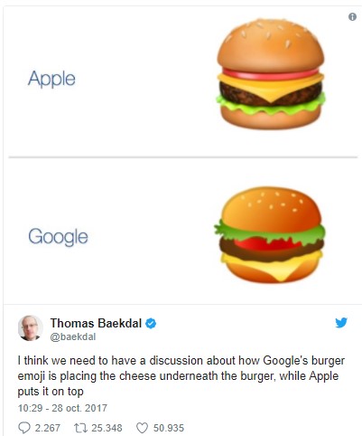 "Creo que necesitamos tener una discusión sobre cómo el emoji de la hamburguesa de Google coloca el queso debajo de la carne, mientras que Apple lo pone arriba".