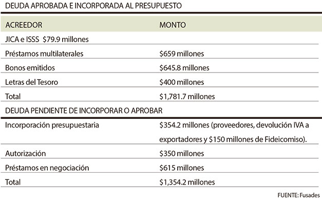 De acuerdo a Fusades, falta que la Asamblea Legislativa incorpore $354.2 millones en el presupuesto. Estos fondos provienen de $1,000 millones de bonos colocados en el mercado internacional por el Ministerio de Hacienda el 8 de julio. Los restantes $645 millones fueron utilizados para reforzar el presupuesto.