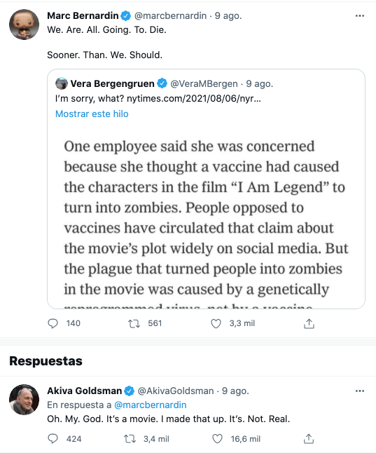 'Soy leyenda' no es la primera película que es utilizada como 'fundamento' para el movimiento antivacunas, títulos como 'Hijos de los hombres', 'Resident Evil' o 'Matrix' han aparecido en memes que cierta población escéptica ha tomado como referencia real, algo que comienza a preocupar, tal y como lo expresa en redes sociales Vera Bergenguren, periodista de Time.
