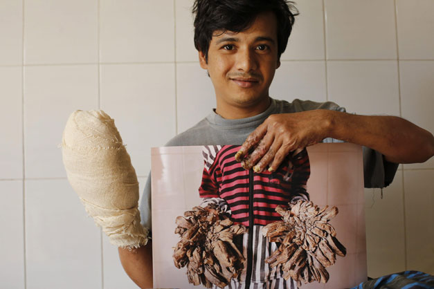 La impactante imagen de este joven de la provincia sureña de Khulna, que desarrolló voluminosas verrugas con forma de corteza de árbol en manos y pies, llegó a principios del año pasado a los medios de comunicación de todo el mundo.