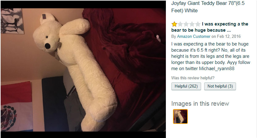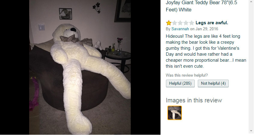 "Horrible! Las piernas son como de 4 pies de largo haciendo que el oso se vea como algo espeluznante. Conseguí esto para el Día de San Valentín y preferiría tener un oso más proporcional y más barato ... Quiero decir que esto ni siquiera es lindo", comentó un cliente en la página de Amazon junto a la fotografía del oso sentado en un sofá.