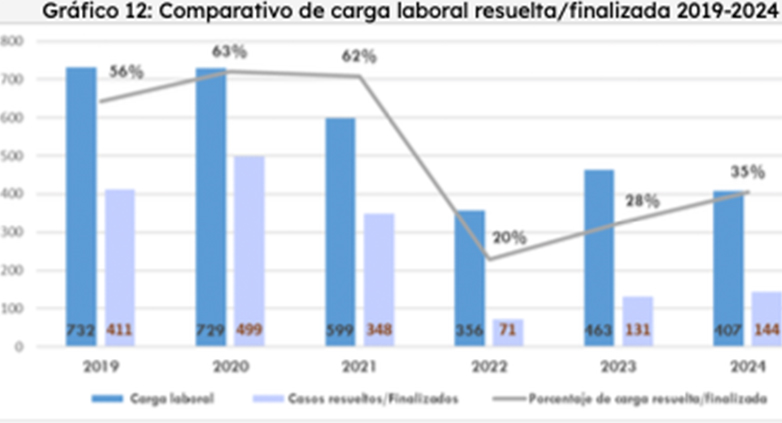 En 2024, la cantidad de casos resueltos aumentó 7 % en comparación con 2023, sin embargo, en comparación con 2021 cayó casi a la mitad en comparación con el 62 % de 2021. / Acción Ciudadana.