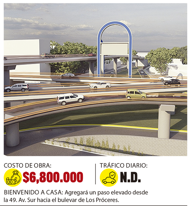 Rodríguez explicó que otra zona que será intervenida es el bulevar de Los Próceres, en donde se harán obras, complementarias a dos pasos existentes.La propuesta del Ejecutivo involucra un nuevo paso elevado en la zona del monumento Bienvenido a Casa. Con este se busca beneficiar a los automovilistas que salen de la 49 avenida Sur y que se incorporan al bulevar con rumpo al occidente de la capital.