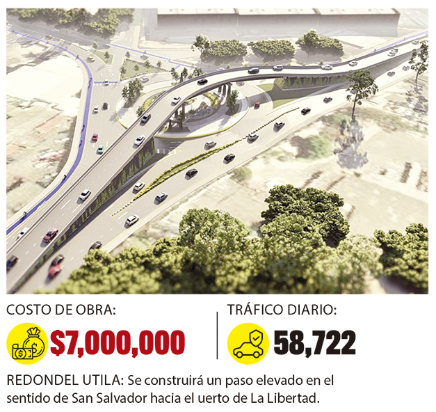 Los pasos garantizarán que el paso vehicular sea más ágil y mucho más seguro. El redondel servirá como retorno y los giros a la izquierda”. Romeo Rodríguez, ministro de Obras PúblicasLa última de las obras se construirá en la intersección del bulevar Sur y la carretera al Puerto de La Libertad (en la colonia Utila), un punto crítico que además conecta con varios municipios del departamento de La Libertad.
