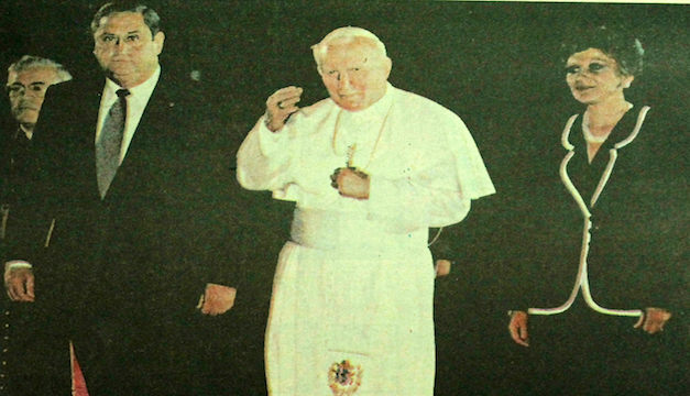 El papa Juan Pablo II junto al entonces presidente Armando Calderón Sol y la primera dama, Elizabeth de Calderón, al ser despedido en el aeropuerto de Ilopango.