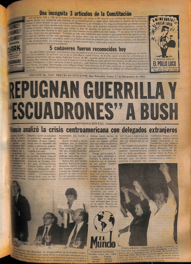 Bush fue vicepresidente de Ronald Reagan entre 1981 y 1989 y como tal, visitó El Salvador en 1983 y fue recibido por el presidente interino Álvaro Magaña, el ministro de Defensa, Carlos Eugenio Vides Casanova, y representantes de todos los partidos políticos salvadoreños en la residencia oficial de la presidencia, ahí hizo un vehemente llamado para el fin de los escuadrones de la muerte y advirtió del riesgo de perder la ayuda económica estadounidense si los asesinatos continuaban.