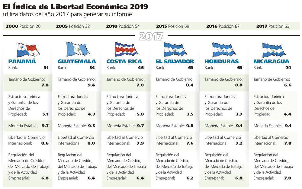 El Salvador se coloca este año en la posición 63 de 175 naciones evaluadas bajo el Índice de Libertad Económica Mundial. El informe elaborado por el Instituto Fraser destacó que el país tuvo un ascenso de seis posiciones, comparado con informes del año anterior, colocándose de esta forma en el cuarto puesto junto con Honduras a nivel centroamericano.