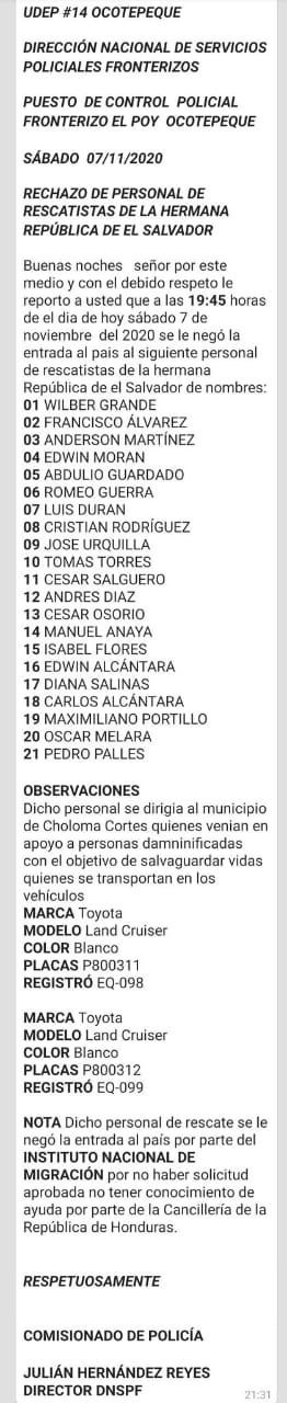 Horas después de conocerse este ofrecimiento un equipo de rescatistas de la Cruz Verde Salvadoreña gestionaba su ingreso a Honduras, pero la solicitud fue rechazada el Instituto Nacional de Migración de Honduras y reiterada por las autoridades policiales fronterizas en El Poy, Ocotepeque.Los rescatistas pretendían apoyar en las labores de rescate en Choloma Cortés.