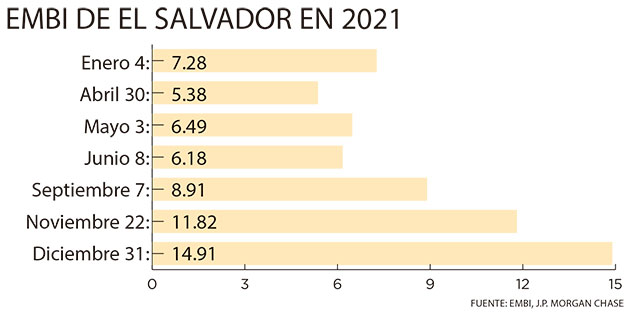 El riesgo país de El Salvador cerró el 2021 con su peor desempeño de los últimos 14 años y se aproxima a los 15 puntos, en un mercado que mira con mayor recelo la capacidad de pago del Gobierno central.