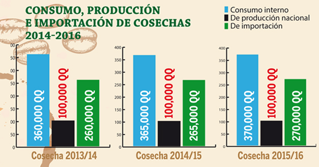 En el balance cafetalero nacional, el Consejo, institución adscripta al Ministerio de Agricultura y Ganadería (MAG), reporta que de la cosecha 2015-2016, el mercado salvadoreño consumió 370,000 quintales de café. De ellos, 100,000 corresponden a la producción nacional, y 270,000 quintales es de importación.
