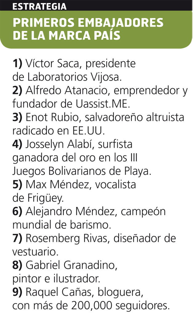 Anoche, el Gobierno presentó a los primeros nueve embajadores de la marca país, todos destacados en diferentes ramas. Ellos son los empresarios Víctor Saca y Alfredo Atanacio, así como Enot Rubio  y la surfista Josselyn Alabí, el músico Max Méndez y el barista Alejandro Méndez . También se eligió al diseñador de vestuario Rosemberg Rivas, al pintor e ilustrador Gabriel Granadino, y a la bloguera de modas Raquel Cañas.