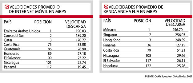 Los datos distan mucho de los primeros lugares del istmo; en redes móviles el primer lugar lo ocupa Costa Rica donde se alcanzan velocidades promedio de descarga de 33.08 Mbps; mientras que en banda ancha fija es Panamá que logra los 127.15 Mbps.