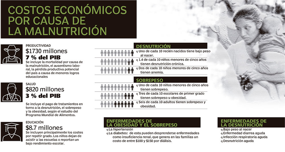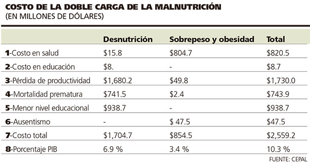 El informe elaborado por la agencia de las Naciones Unidas identificó que en el área de salud se reflejó un costo de $820 millones, un 3 % del Producto Interno Bruto (PIB) del 2017, que incluyeron el pago de tratamientos en torno a la desnutrición, el sobrepeso y la obesidad.