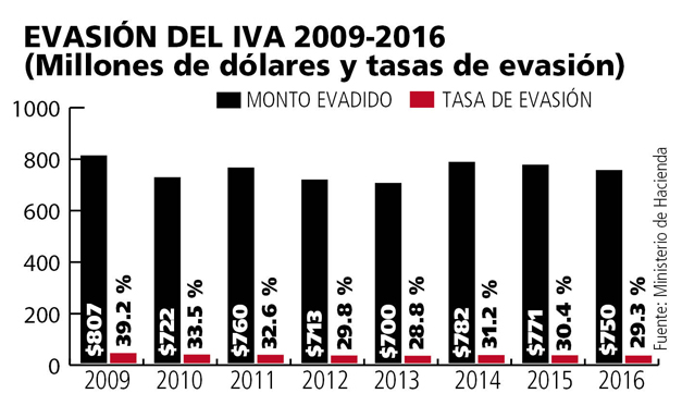 A través del consumo final de los hogares salvadoreños, Hacienda concluyó que la recaudación potencial, es decir, el máximo que se puede recolectar en IVA si no existiera evasión, ascendió a $2,563 millones en 2016. No obstante, en realidad solo se recaudaron $1,813 millones. De esta manera, la evasión del IVA ascendió a $750 millones en 2016, es decir, los contribuyentes eludieron pagar el 29.26 % de la recaudación potencial.