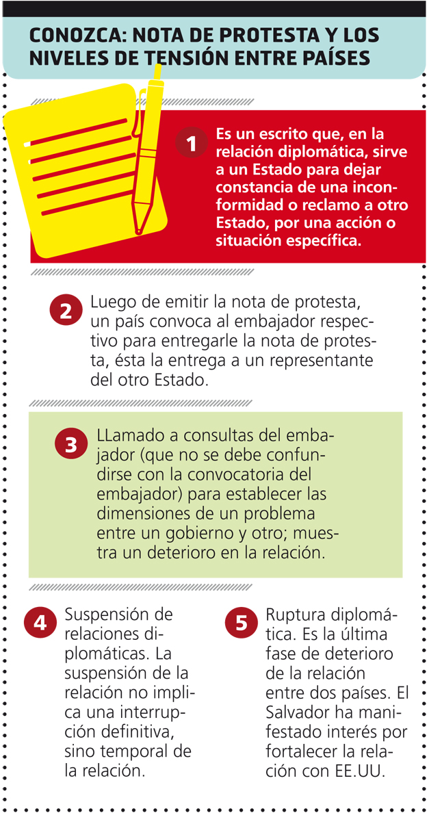 El mandatario salvadoreño leyó un comunicado de prensa en el cual el Gobierno informó de una nota de protesta dirigida a Estados Unidos. La nota de protesta es una constancia por escrito de inconformidad de un Estado con otro Estado. Es el primer nivel de diferencias entre Estados, el último nivel es una ruptura de relación diplomática. Sin embargo, el Gobierno de El Salvador dejó claro que seguirán “trabajando por fortalecer” las relaciones con los Estados Unidos.
