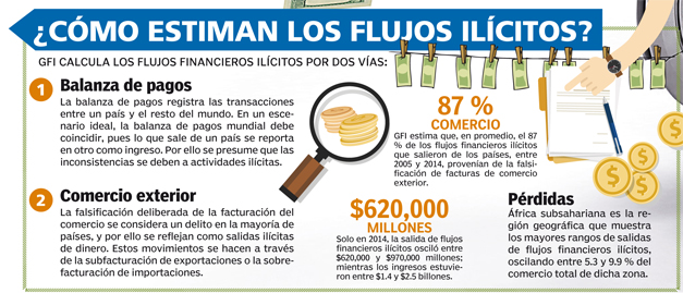 Entre 2005 y 2014, los flujos financieros ilícitos en los países en desarrollo representaron, en promedio, entre el 14 y el 24 % del comercio exterior de estas naciones, equivalentes a $2.010 y $3.507 billones; indica el reporte de GFI. Las salidas de dinero ilícito promediaron entre 4.6 y 7.2 % del comercio total ($620,000 y $970,000 millones), y los ingresos oscilaron entre 9.5 y 16.8 % ($1.391 y $2.537 billones).