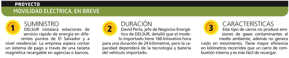 Además, la distribuidora espera presentar una propuesta a la Superintendencia de Electricidad y Telecomunicaciones (SIGET) para contar con un tarifa diferenciada de energía para uso vehicular. “Para que el usuario pueda sentirse motivado a utilizar más su vehículo eléctrico que un carro de combustión interna (gasolina)”, agregó.