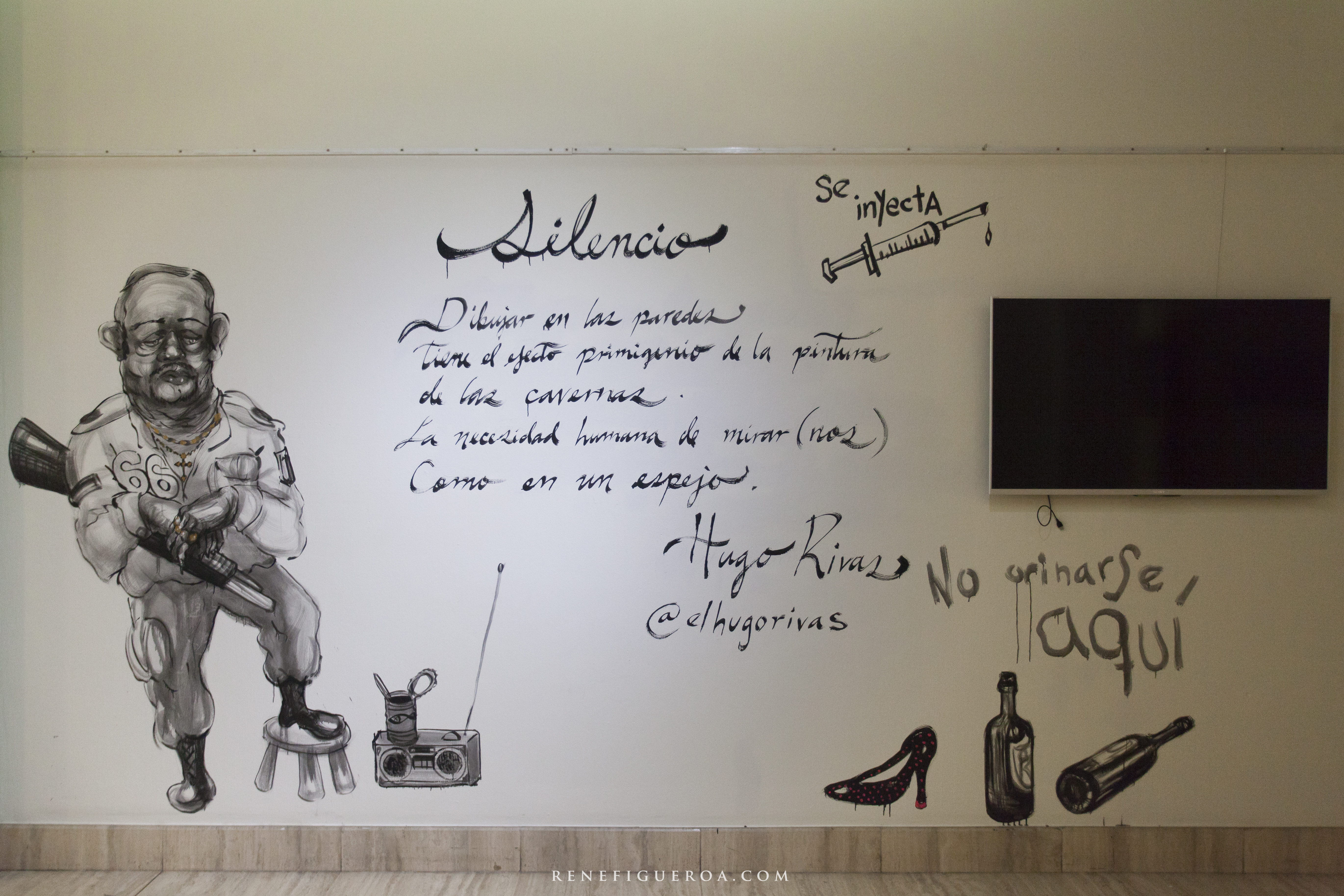 “Silencio” es el título del mural que Rivas realizó inspirado en una serie gráfica que ha desarrollado desde 2014, en donde representa una lectura de la cultura popular “y el clasismo velado que caracteriza nuestra sociedad”. Con tres días de elaboración, el autor de la obra plasmó, en las paredes del recinto, imágenes con similitudes a las de un cuaderno de bocetos, dando soltura a cada muestra pictórica.
