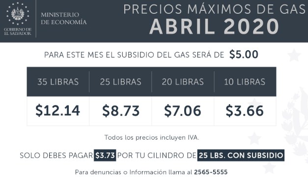 El Gobierno salvadoreño destacó también que pese a las rebajas mantendrá el subsidio. "El monto del subsidio al GLP que otorga el Gobierno de El Salvador en abril de 2020 es de $5.00, por lo que los beneficiarios únicamente aportarán $3.73 de su bolsillo para adquirir un cilindro de 25 libras", dice el Ministerio en un comunicado.