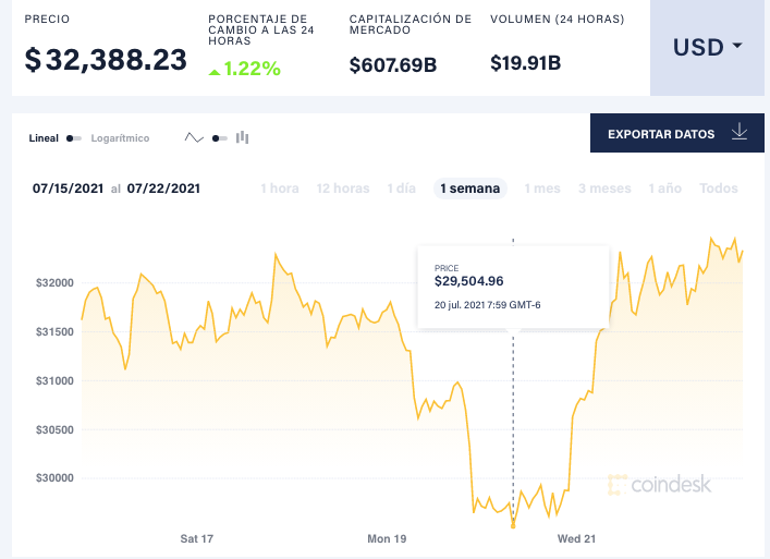 A las 6:00 p.m. del jueves 22 de julio el precio del bitcoin se cotizaba en $32,388, $2,884 mas que los $29,504 que registró el martes 20 a las 6:00 p.m.