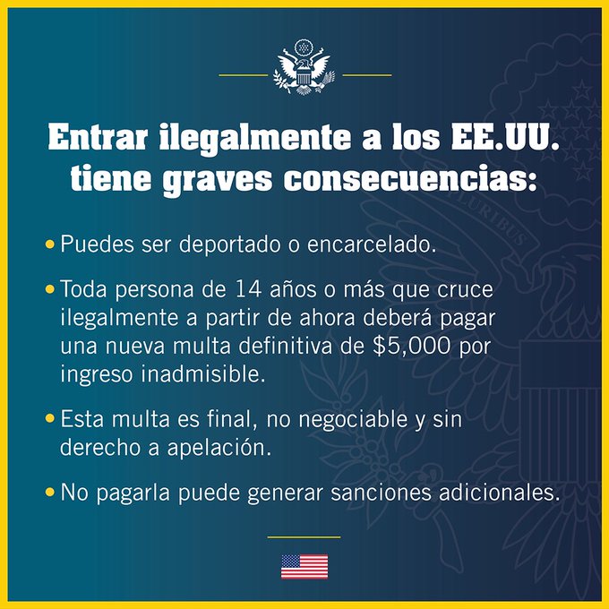 "Toda persona de 14 años o más que cruce ilegalmente a partir de ahora deberá pagar una nueva multa definitiva de $5,000 por ingreso inadmisible. Esta multa es final, no negociable y sin derecho a apelación". Embajada de Estados Unidos en El Salvador.