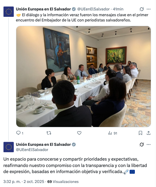El diplomático europeo escribió en X que este es el primer encuentro con profesionales de la información en El Salvador, pues busca establecer puentes de diálogo "el papel de la Unión Europea como actor global y socio confiable".