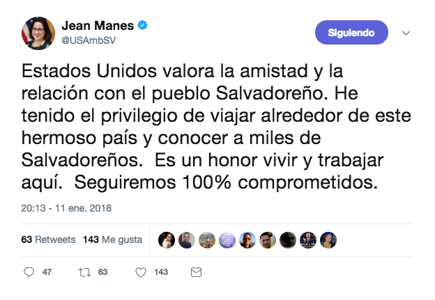 A las 8:13 de la noche, en Twitter, Manes primero expresó que Estados Unidos "valora la amistad y la relación con el pueblo salvadoreño".