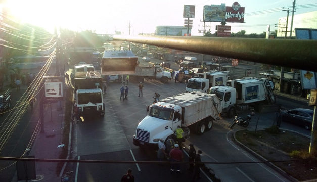El tráfico ha sido paralizado por completo en el bulevar del Ejército, donde empleados de la alcaldía de Soyapango han bloqueado el paso atravesando camiones recolectores de basura; conductores buscan calles alternas para llegar al centro de San Salvador.
