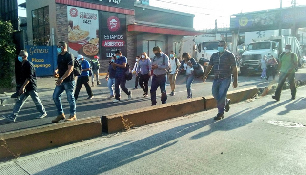 Además del salario, los proyectos que están parados, becas, ayudas humanitariasa nuestra gente. Las becas no las hemos pagado, no tenemos las ayudas humanitarias, no podemos seguir los proyectos y como remate las municipalidades pequeñas vivimos del Fodes o de un préstamo como lo hacía el señor Bukele cuando era alcalde. José Guzmán, alcalde de Estanzuelas, Usulután.Tras el cierre en los accesos a la capital, decenas de personas han decidido caminar para llegar hasta su destino.
