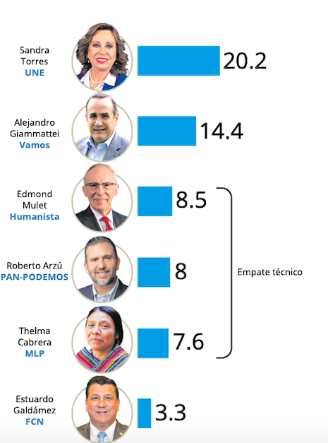 La exesposa del expresidente Álvaro Colom, Sandra Torres, de la Unión Nacional de la Esperanza (UNE) encabeza la encuesta con un 20.2 % de las preferencias, seguida por el médico Alejandro Giammattei -del partido Vamos- con 14.4.