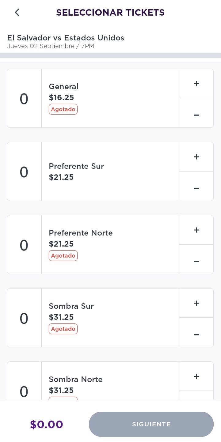 Según la plataforma, las localidades Sol General ($16.25), Preferente Norte ($21.25), Sombra Sur y Norte ($31.25), Tribuna Sur y Norte ($41.25), así como la opción de Platea ($51.25) están totalmente vendidos. Hasta las 10:00 de la mañana de este lunes solo Preferente Sur ($21.25) mostraba disponibilidad.