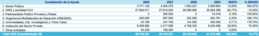 Durante 2023, el Reino de España canalizó la ayuda por medio de siete rubros, entre ellos, sector público, oenegés, sociedad civil, partenariados públicos, privados y redes, organismos multilaterales de desarrollo, universidades, instituciones de investigación, instituciones del sector privado y otras entidades.
