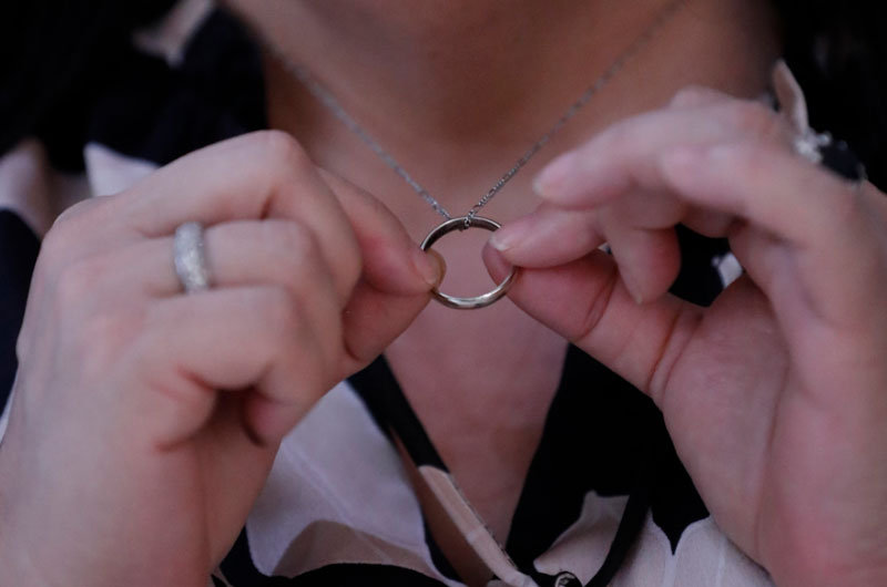 García mostró en su cuello el anillo de matrimonio de su esposo que porta desde que Hernández fue recluido en una cárcel de los ‘Cobras’, de la Policía Nacional, el día que fue capturado, el 15 de febrero de 2022.