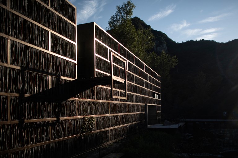 La biblioteca Liyuan tiene una estructura de acero y vidrio. Pero las fachadas del edificio están revestidas por las ramas de los árboles de alrededor, que están dispuestos verticalmente.