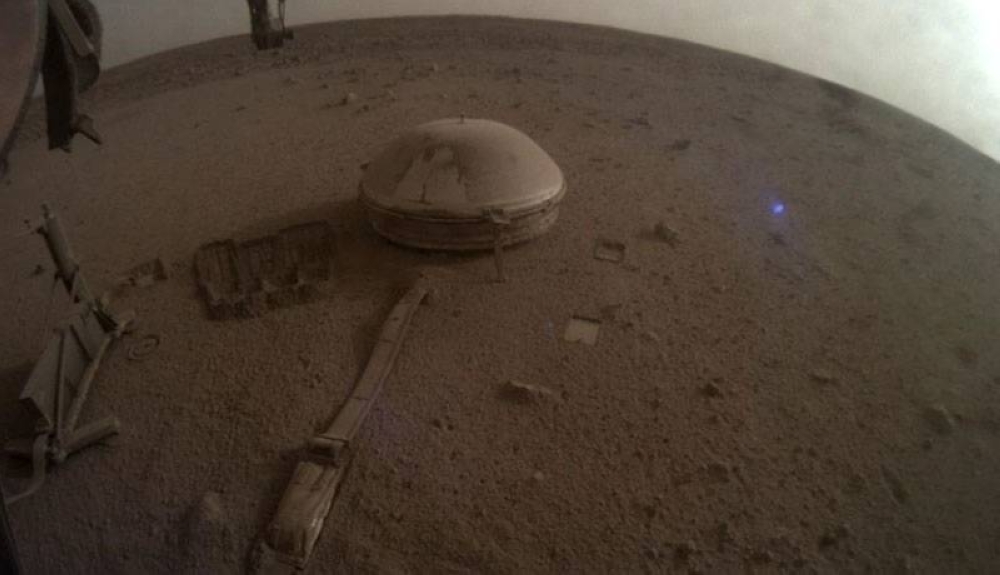 La foto muestra en primer plano el sismómetro de la misión, cubierto parcialmente de polvo.