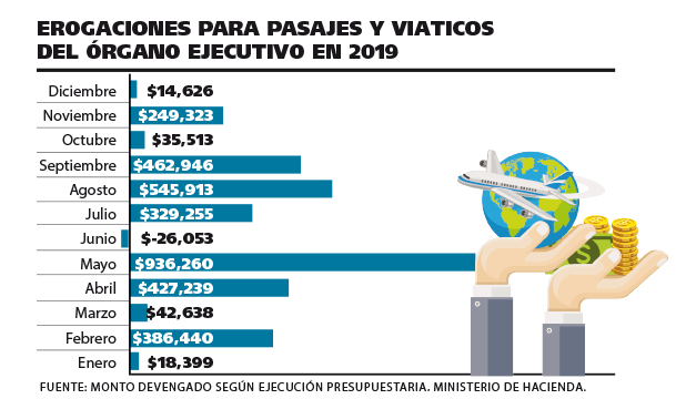 Las instituciones del Estado, incluidas las del Gobierno Central, instituciones descentralizadas y empresas públicas, han erogado un total de $16.8 millones en viajes y viáticos, aunque ya tienen comprometidos $17.8 millones, de enero a noviembre de 2019.