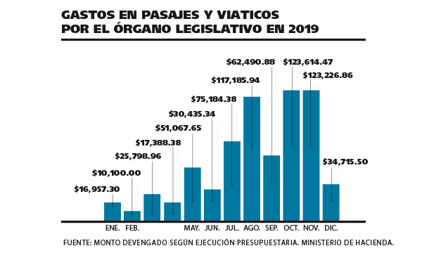 El Órgano Legislativo ha previsto un gasto de $856,143 en viáticos y viajes para el presente año; hasta noviembre, la Asamblea Legislativa ha gastado $688,165 en ello. El Órgano Judicial también reporta un gasto de $539,918 en pasajes y viáticos.