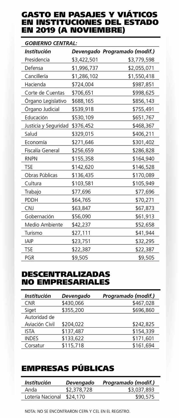Un listado de mayor a menor gasto en viáticos y viajes permite ver que el mayor gasto lo ha ejecutado la Presidencia de la República, que ha erogado de enero a noviembre un total de $3,422,501. Esta institución tiene un presupuesto programado de $3,779,598 para viajes y viáticos del año 2019; su presupuesto inicial para este rubro fue $3,178,440.