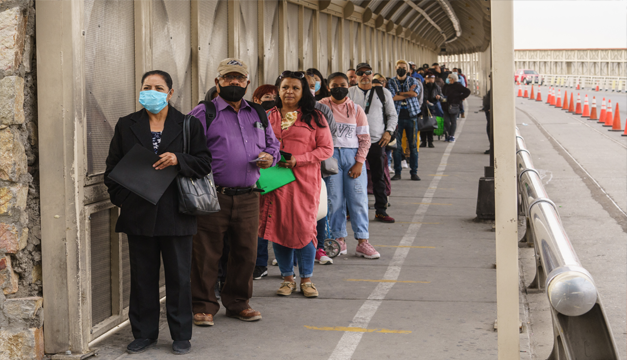 La gente espera en la fila para pasar la aduana y entrar a los Estados Unidos en el puerto de entrada Paso Del Norte en el centro de El Paso, Texas, el 8 de noviembre de 2021. PAUL RATJE / AFP
