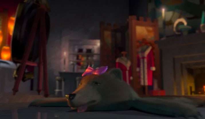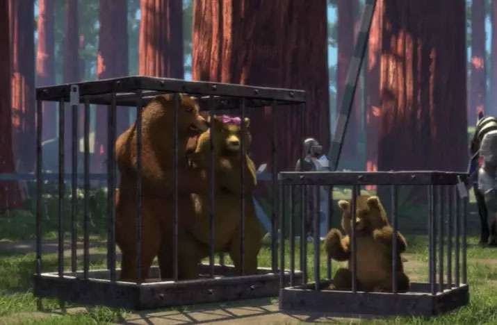 En una escena vemos a las criaturas del bosque acosadas por las tropas del rey, y vemos a la familia Oso, Papá, Mamá y el Pequeño Osito, dentro de una jaula.