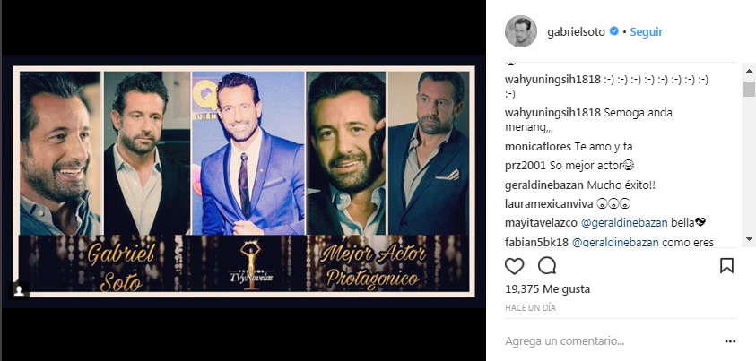 "Mucho éxito", fueron las palabras que escribió Bazán en una publicación de Soto en su cuenta de Instagram, quien invitó a sus seguidores a votar por él tras su nominanción como mejor "actor protagónico".