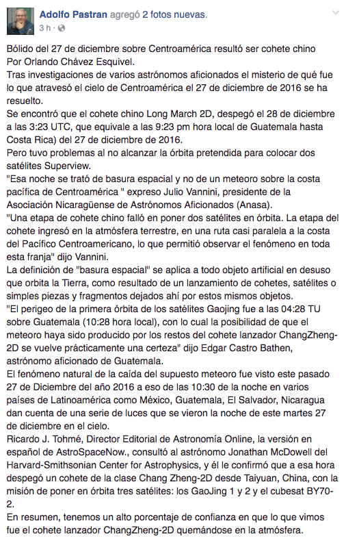 "Una etapa de cohete chino falló en poner dos satélites en órbita. La etapa del cohete ingresó en la atmósfera terrestre, en una ruta casi paralela a la costa del Pacífico Centroamericano, lo que permitió observar el fenómeno en toda esta franja" dijo Vannini.