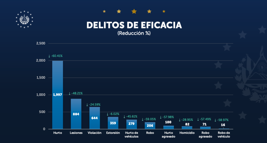 Villatoro aseguró que las reducciones de delitos en el último año responden a las estrategias de seguridad implementadas en contra de estructuras criminales, como la aplicación del régimen de excepción, que ya lleva más de 90,840 capturados.